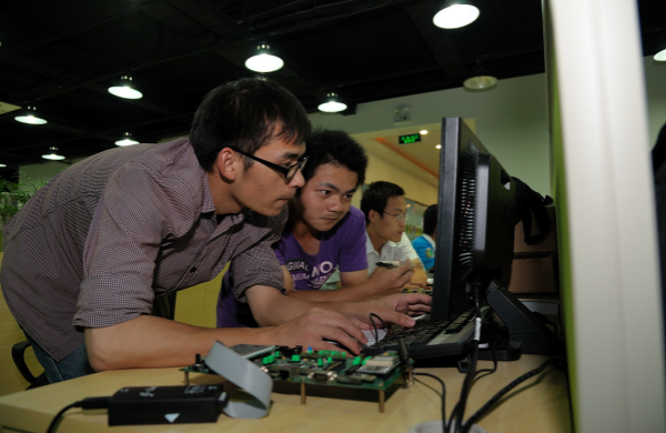工程案例教学现场 创新小组共同调试四轴飞行器