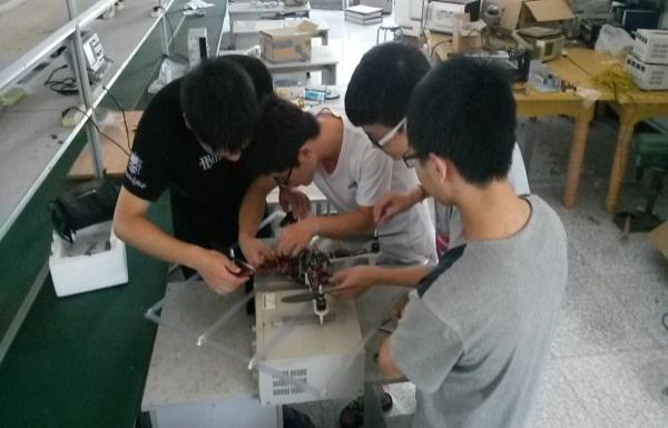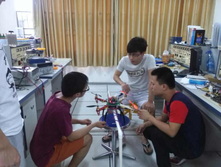 工程案例教学现场 创新小组共同调试四轴飞行器