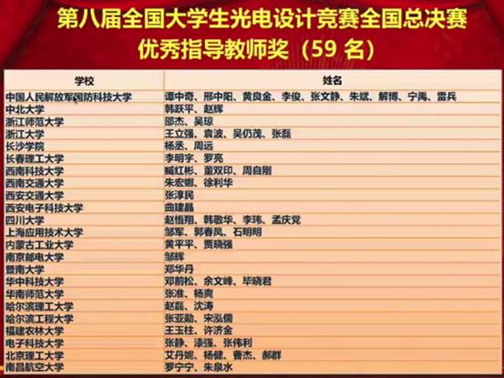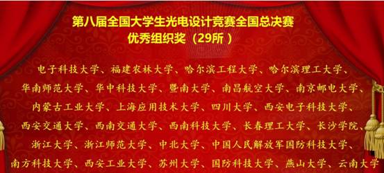 8月30日,电信学子在第八届全国大学生光电设计竞赛总决赛荣获全国一等奖金奖和全国三等奖,杨丞和周远老师荣获全国总决赛优秀指导教师奖,我校荣获全国总决赛优秀组织奖。