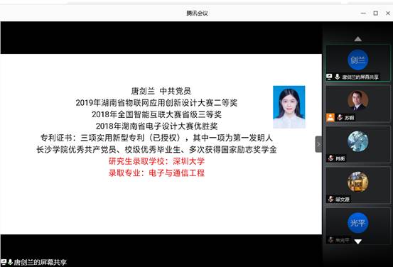 唐剑兰、王子璇、肖衡在本科就读期间,先后与其他同学合作获得省级以上学科竞赛奖励九项,其中包括一项国家一等奖。2018年秋季,他们三人组队参加湖南省大学生物联网创新设计大赛,取名“进度飞起队”,在通信工程系李玮、苏钢老师指导下斩获省二等奖,为我校获得全省团体第三名做出贡献。2020年秋季,三名同学又将一起步入硕士研究生学习阶段。因此,三人在发言和回答问题中,不仅多次流露对母校培养的感激之情,还不止一次提及学科竞赛对于专业思维、心理素质的提升作用。