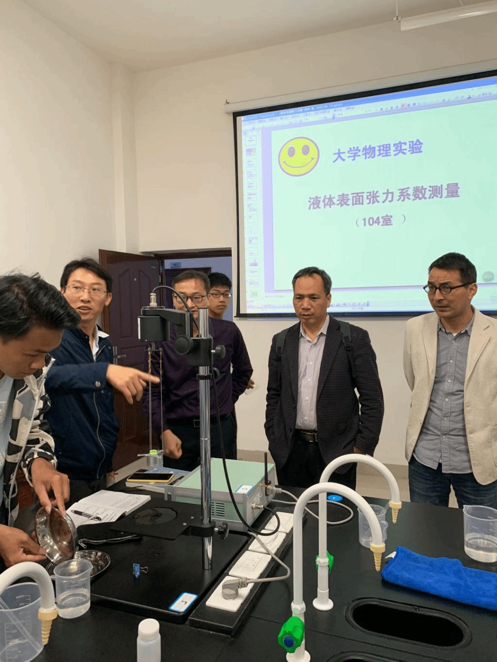在结束中南大学之行后,一行人又来到湖南大学物电学院,参观了湖南大学物电院的实验教学中心。在该院副院长曾建平、物理实验中心何主任带领下重点参观了物理基础实验室,并就实验设备的添置、维修保养、教师自研实验设备等情况展开交流探讨,获益匪浅。
