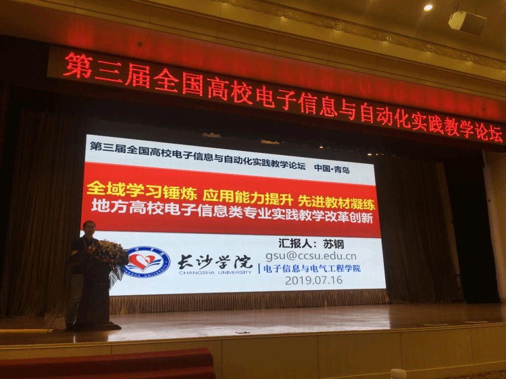 据悉,这是苏钢老师连续三届在该论坛做专题报告发言。2017年他分享了《数字电子技术》单门课程的理论、实验和课程设计的一体化整合方法,2018年他汇报的是模拟电路、数字系统和嵌入式系统的“大课程群”的贯通式构建思路。今年他的报告则是对标工程教育专业认证“复杂工程问题解决能力”培养要求,概述依托湖南省高校“双一流”应用特色学科建设促进“一流本科”专业建设的整体思路,全方位阐述了我校电子信息类专业实践教学的顶层设计、重构策略及系统性探索。