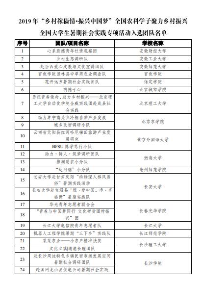 申报的“赴长沙周边特色乡镇民宿市场发展空间暑期社会调研”团队和“赴国网龙山县供电公司暑期社会实践”团队获批“2019年“乡村稼穑情·振兴中国梦”全国农科学子聚力乡村振兴全国大学生暑期社会实践专项活动”立项。