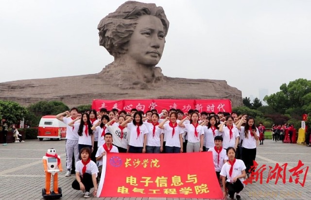 在橘子洲头,团员青年们开展寻迹游戏,即以学院特色校园文化项目—“管培素拓项目”为蓝本,将全体团员青年划分8组,每组成员在音乐喷泉广场、沁园春长沙新诗词碑、湖南省两型社会纪念馆、谁主沉浮雕像群四个指定地点,分别完成“五四青年笑脸”“诵读伟人诗词”“定格热血瞬间”“情景再现峥嵘岁月”四项任务。通过参与巧思设计的任务,大家在游戏活动中体验“爱国、进步、民主、科学”的五四精神。在洲头的毛泽东青年艺术雕像前。团员青年们齐唱国歌,瞻仰先烈,在机器人“旺仔”的带领下,重温入团誓词。